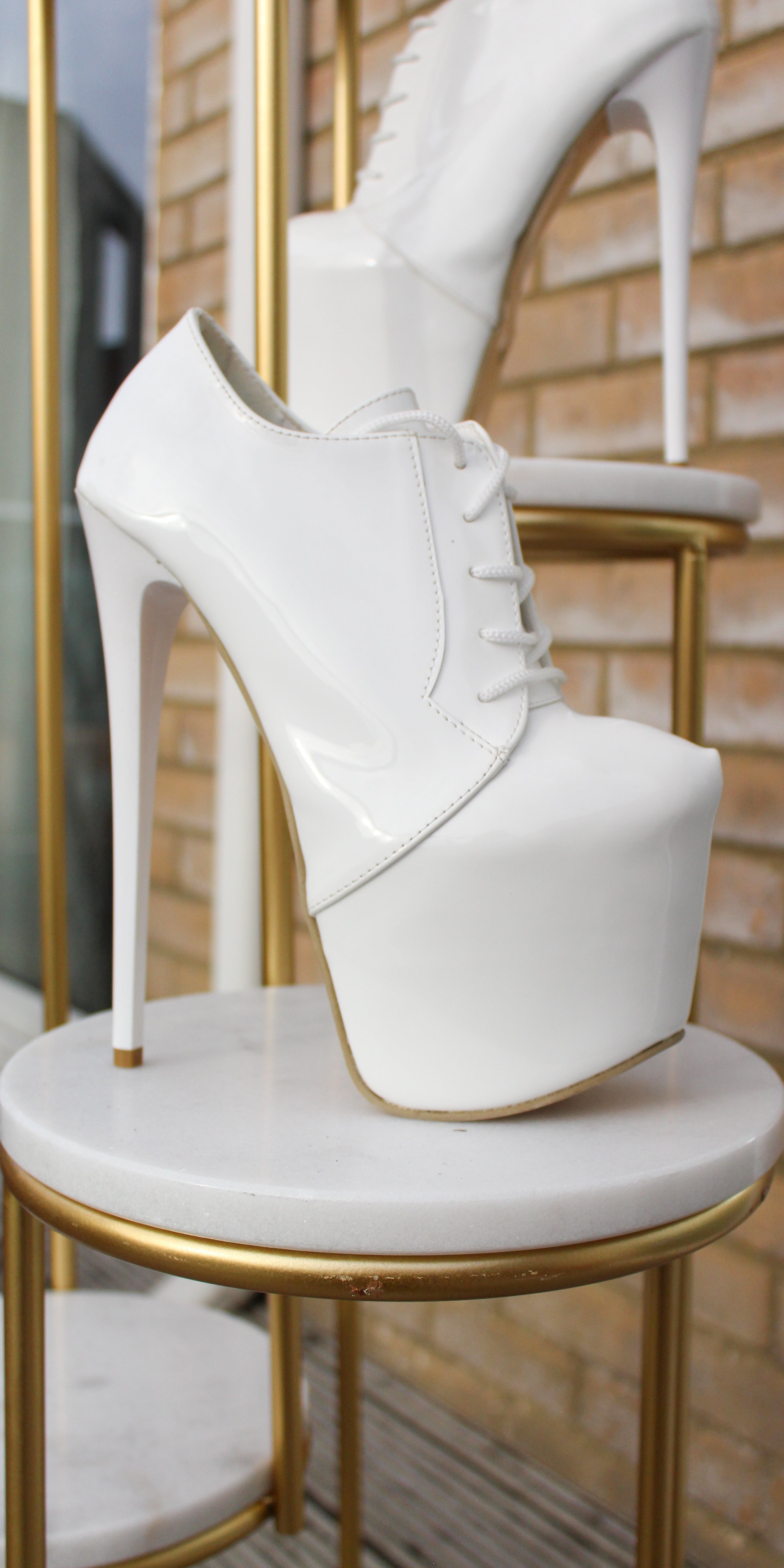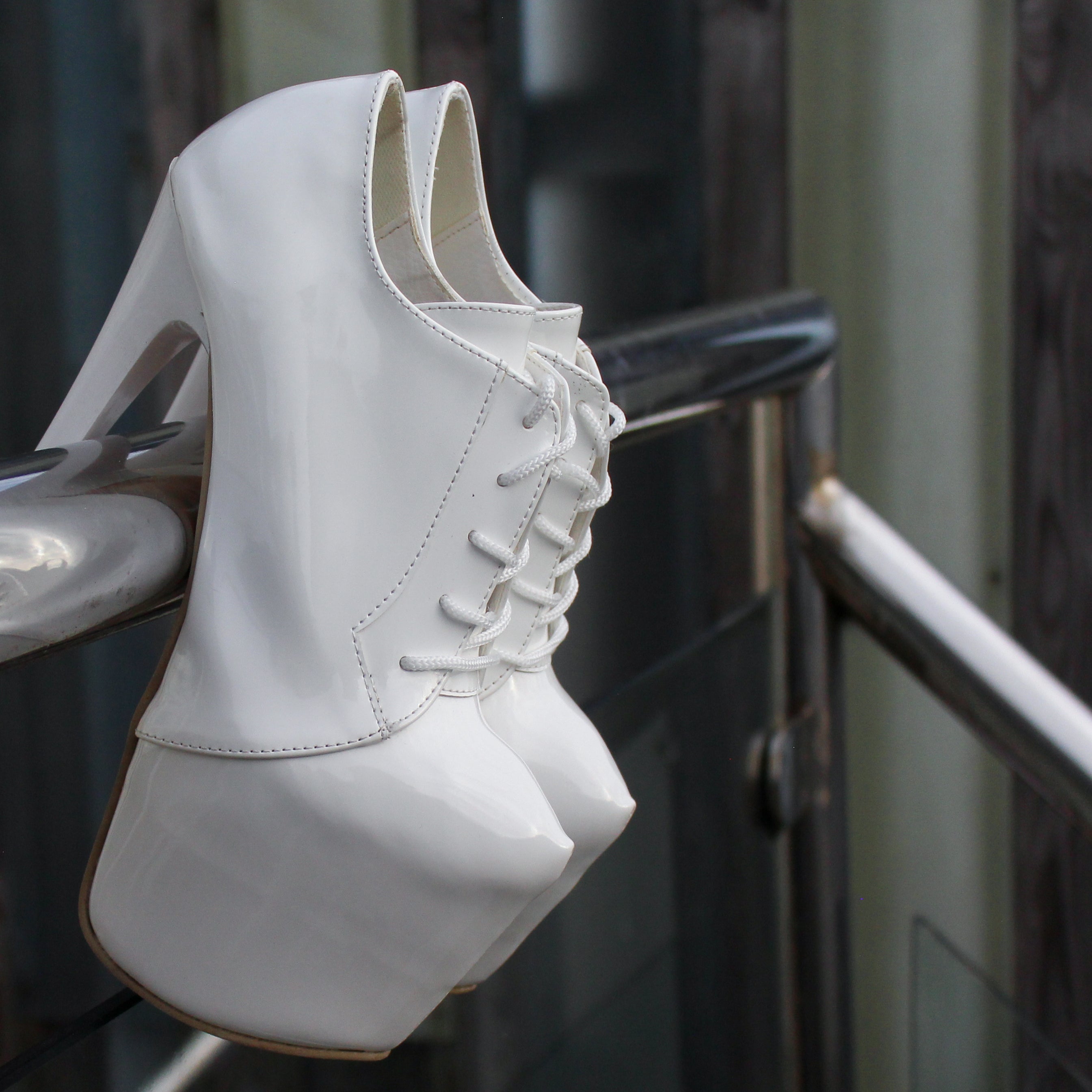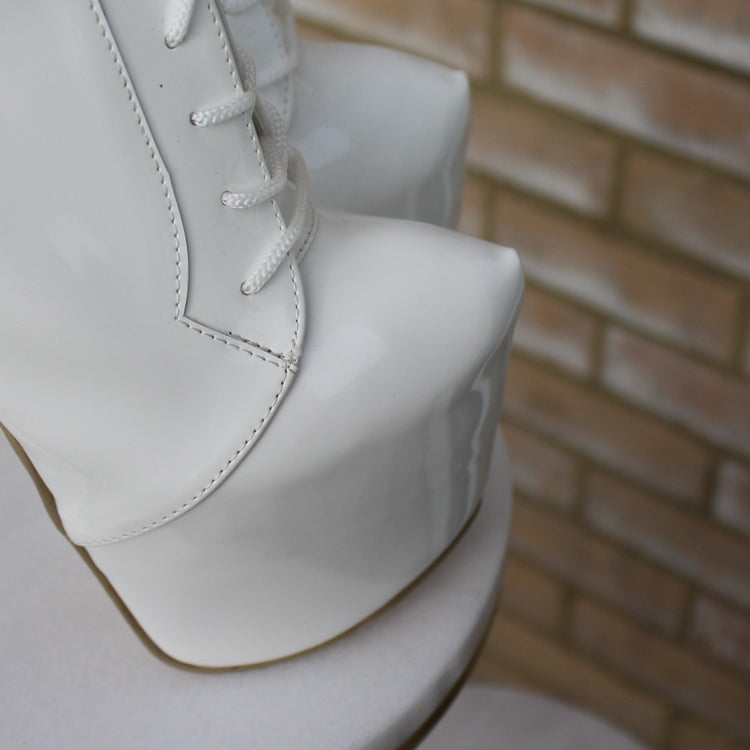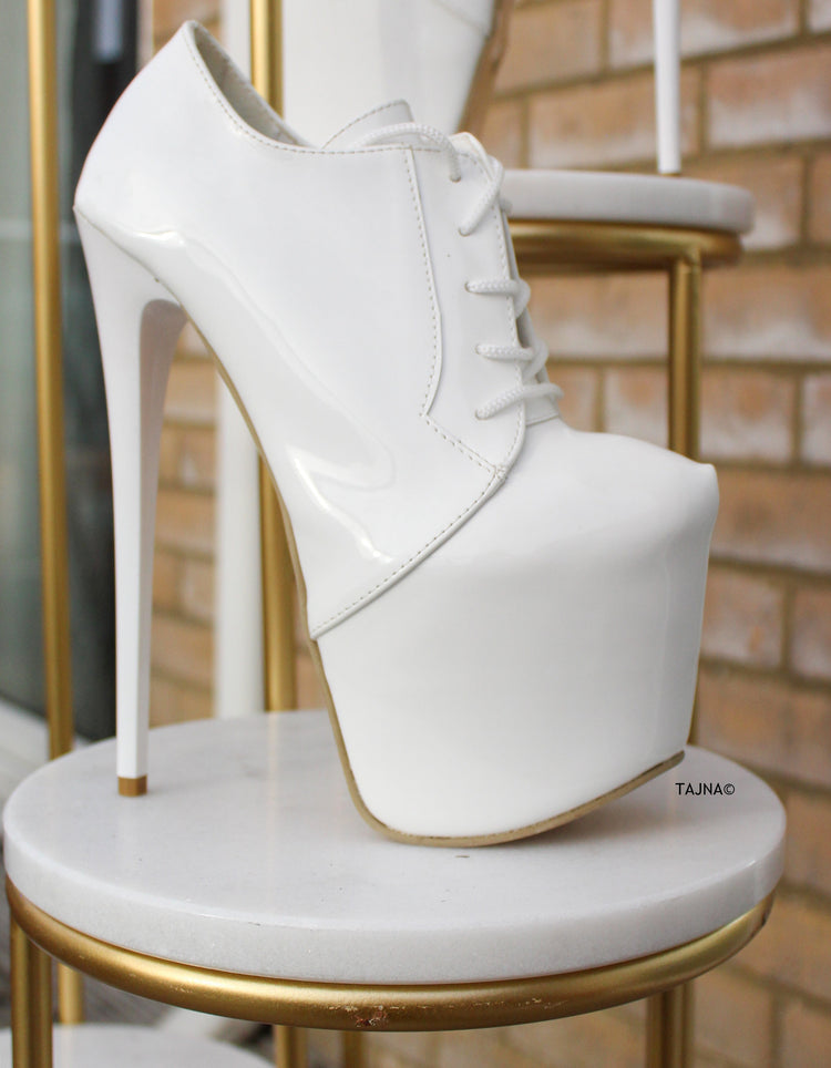 White Gloss Lace Up Oxford High Heel Booties