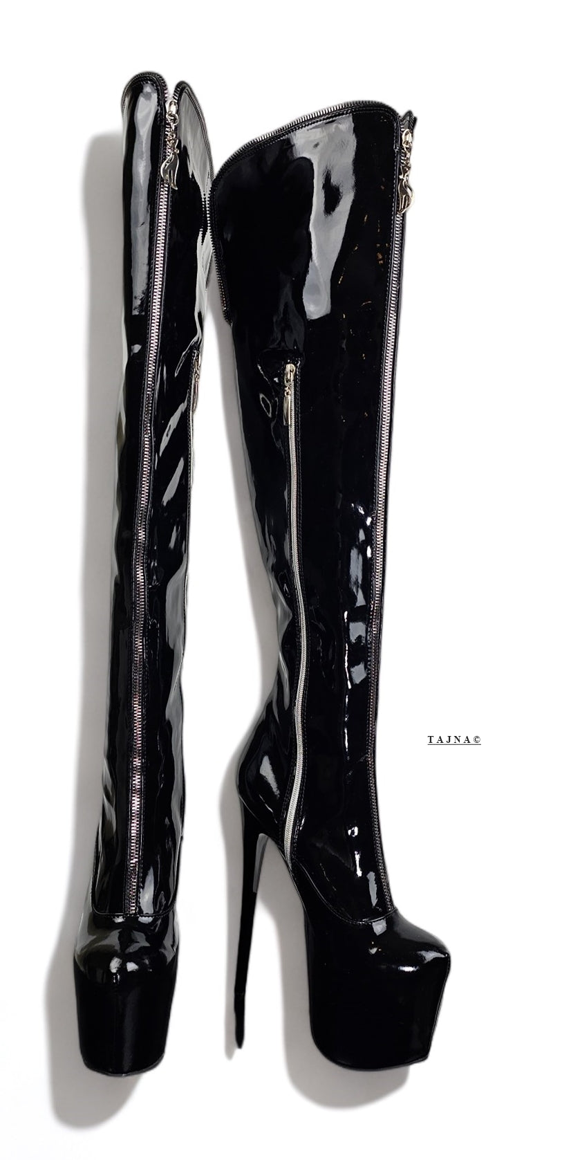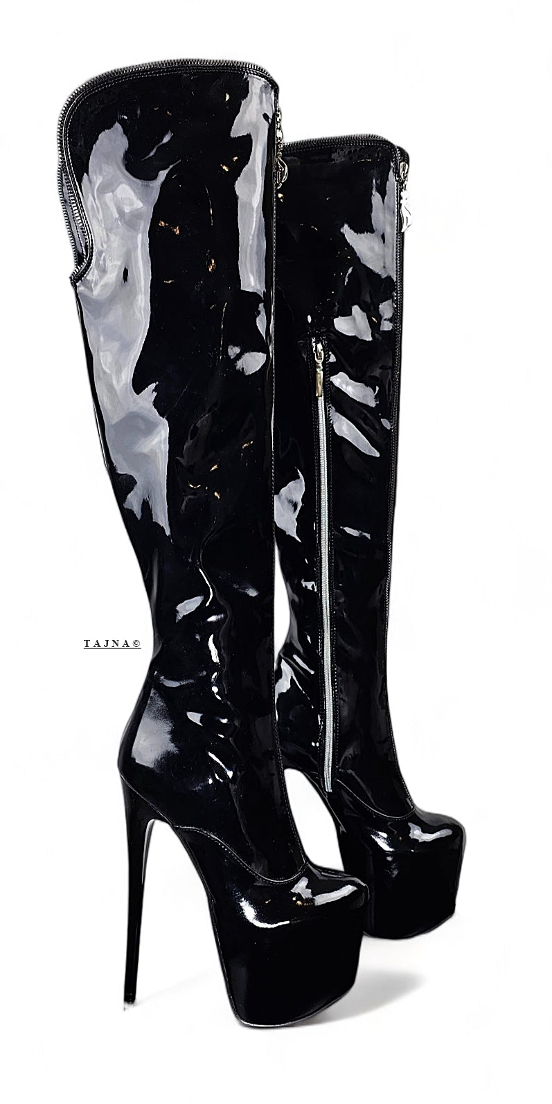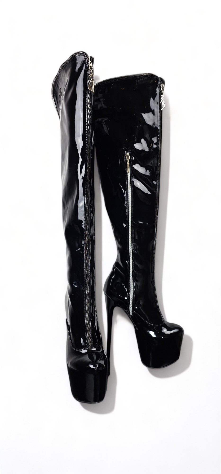 Over the Knee Black Gloss Zip Detailed High Heel Boots