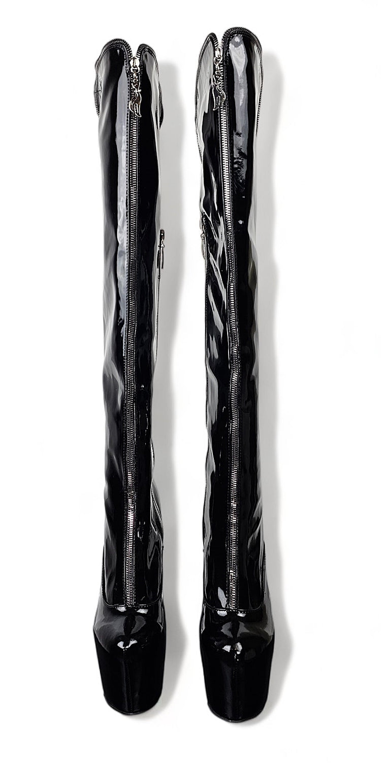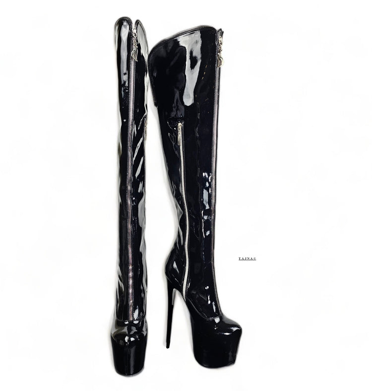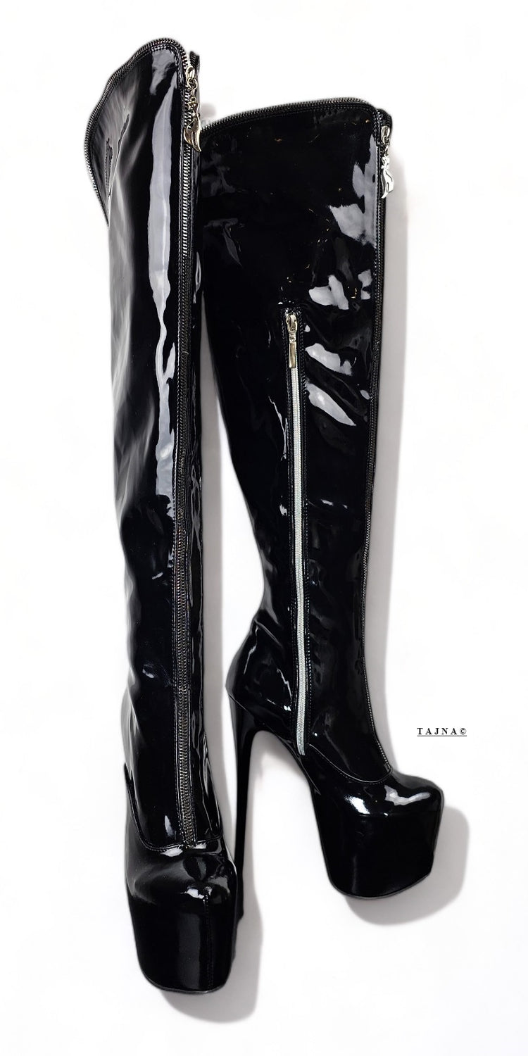 Over the Knee Black Gloss Zip Detailed High Heel Boots