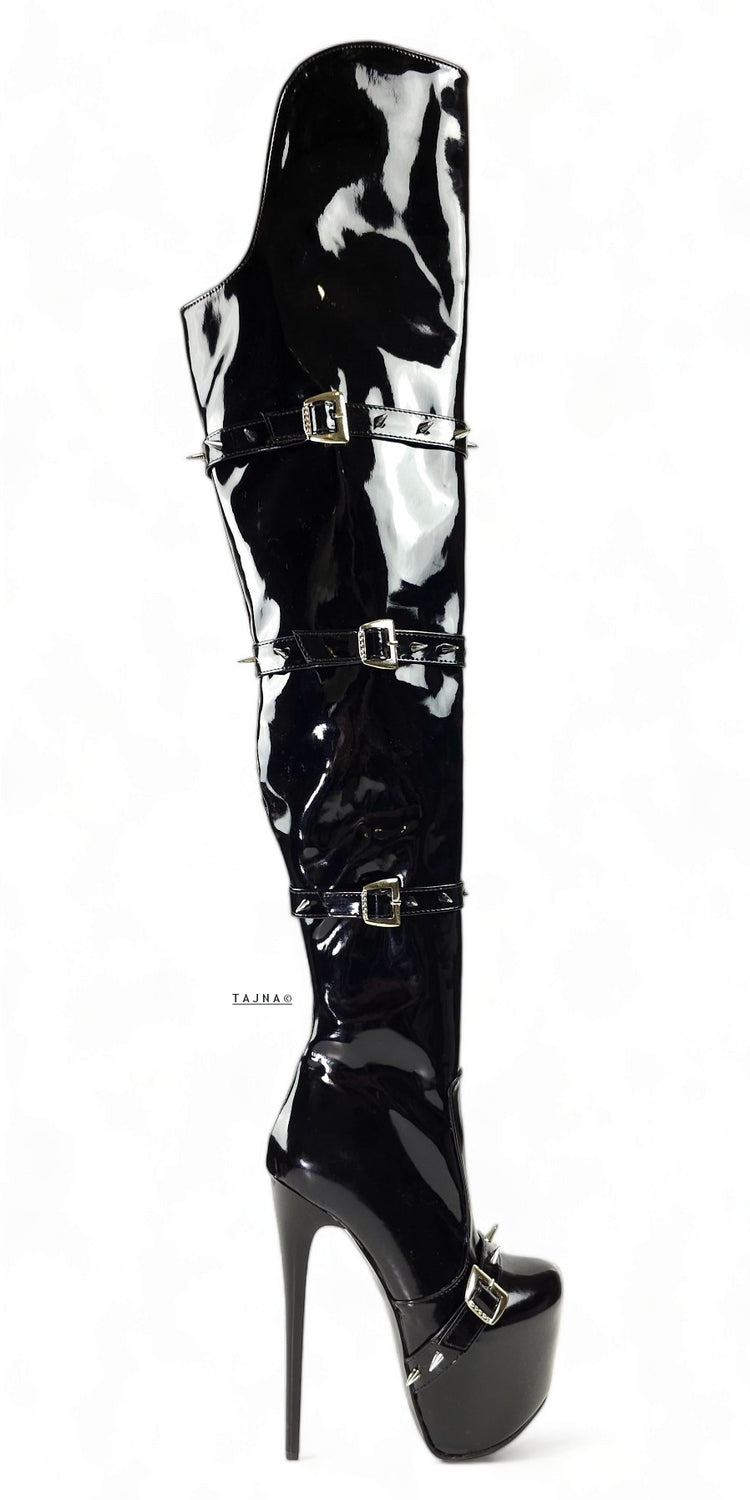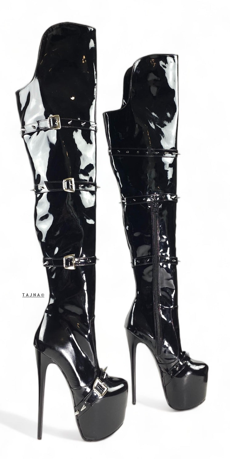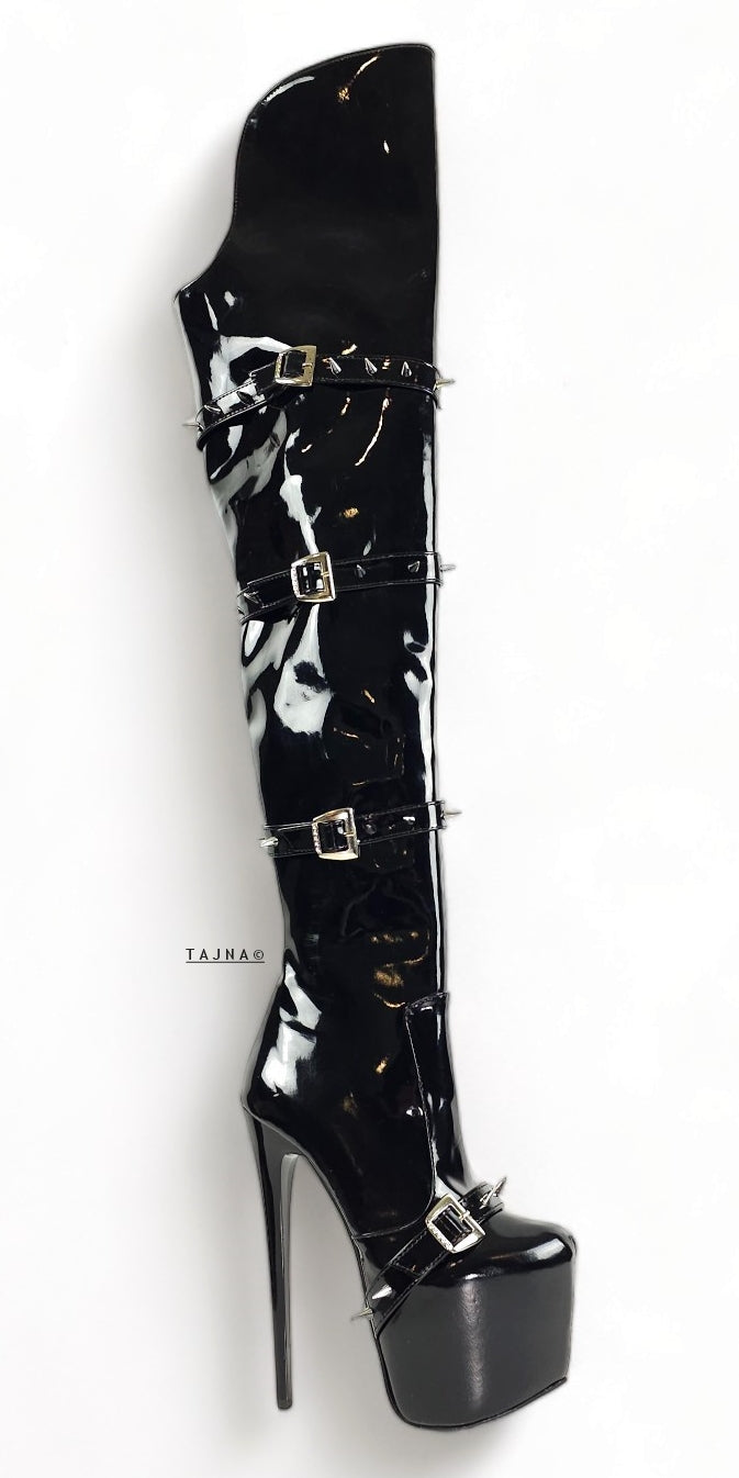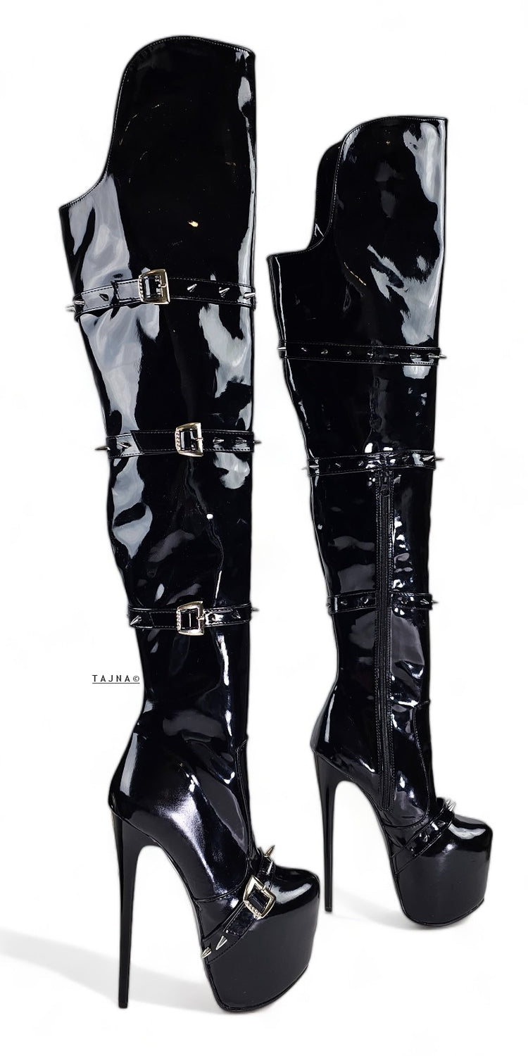 Black Gloss Spike Belted Thigh High Platform Boots