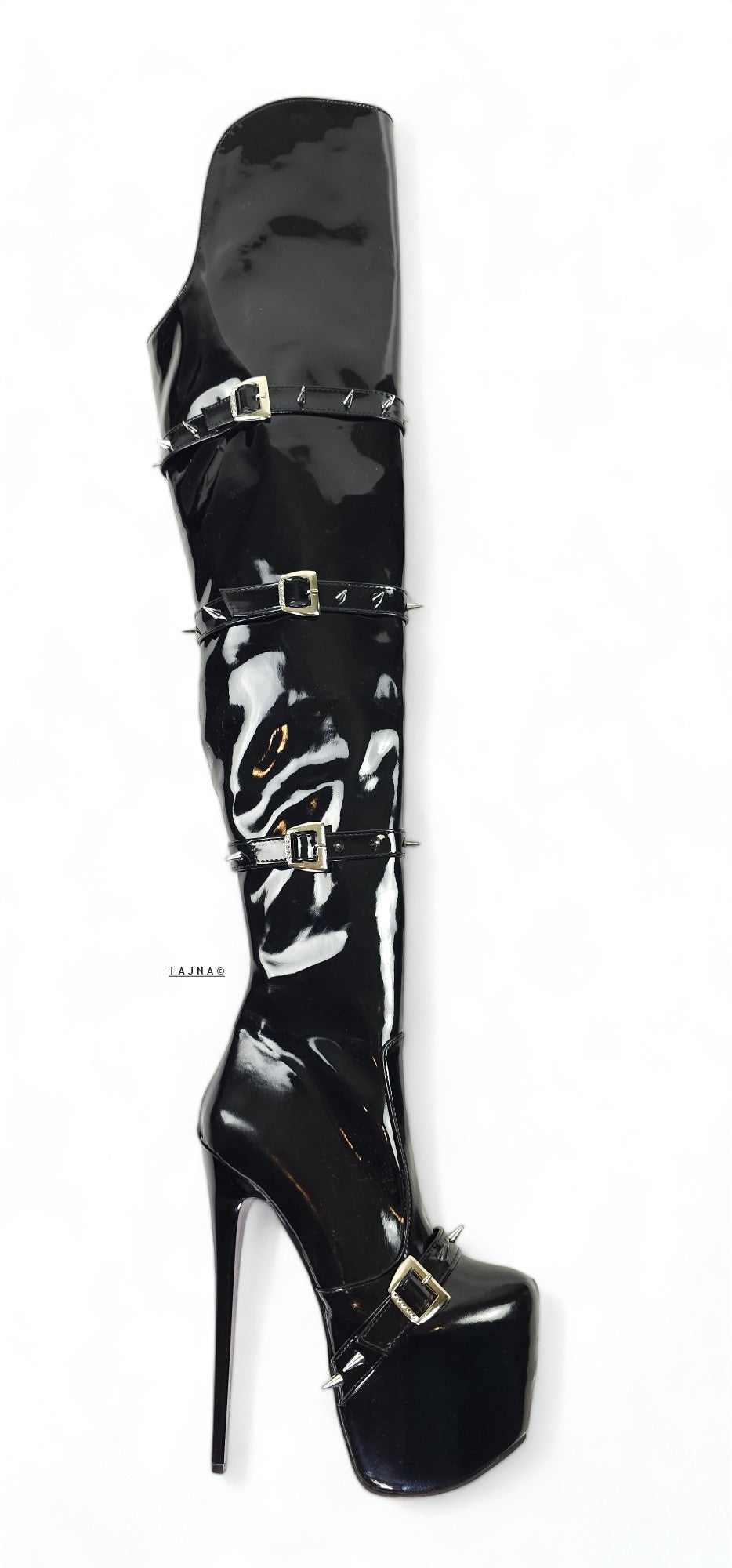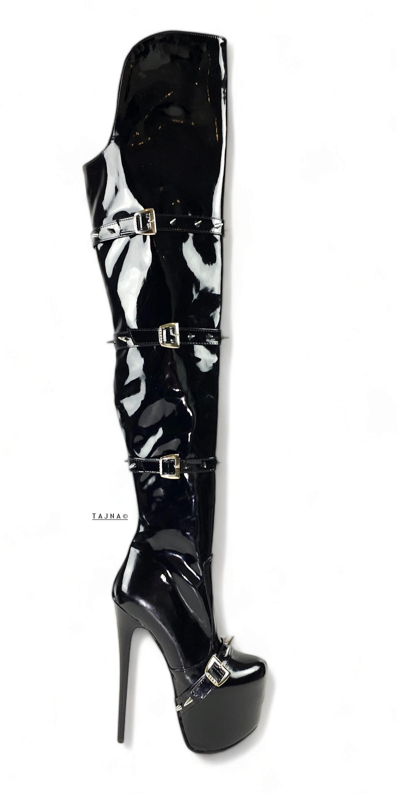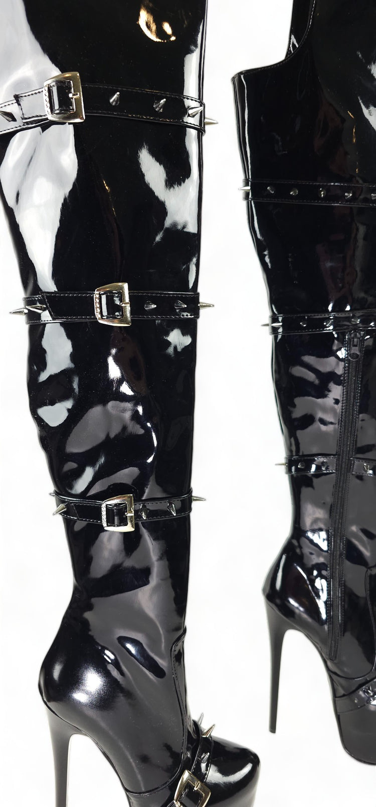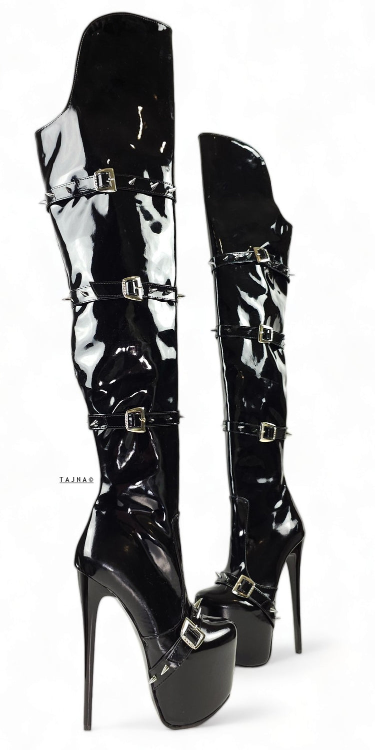 Black Gloss Spike Belted Thigh High Platform Boots