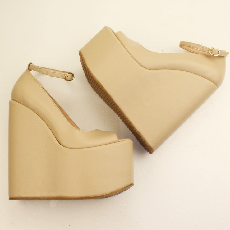 Peep Toe Cream Ankle Strap Platform Wedge Shoes